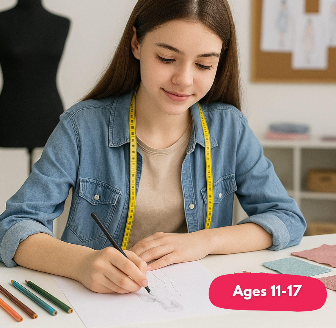 Our fashion programs start as young as age two. Toddlers learn in our fashion themed craft classes. Ages 5-6 learn to sew in a dedicated, small sewing class just for them. Kids 7-12 will sew two real and wearable garments or accessories in a six week sewing course while teens 13-17 can design their own custom garment and learn the process from design to creation. Adult learners can choose from a group craft or sewing workshop or schedule their own private one-on-one or group sewing lesson.