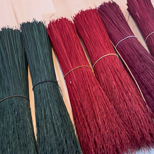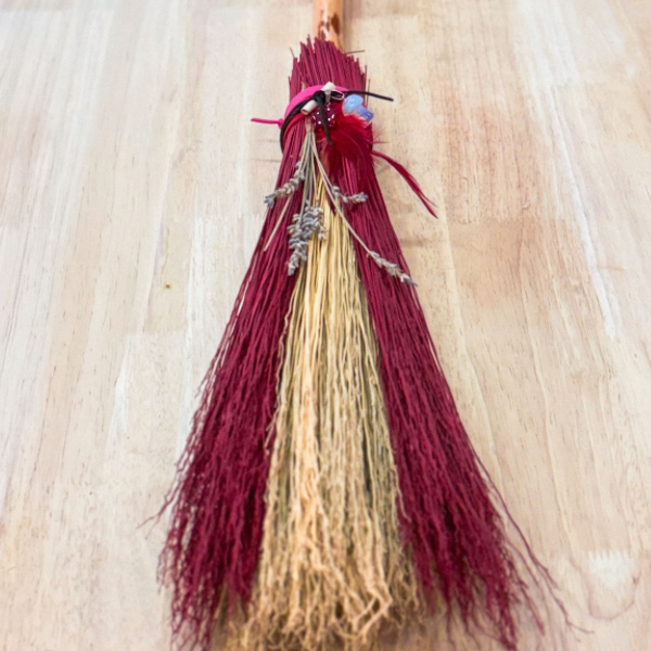 All materials: natural broomcorn in multiple colorways, 42" natural polished handle, wire, ribbon, crystals/charms, dried herbs, feathers, and parchment for intentions